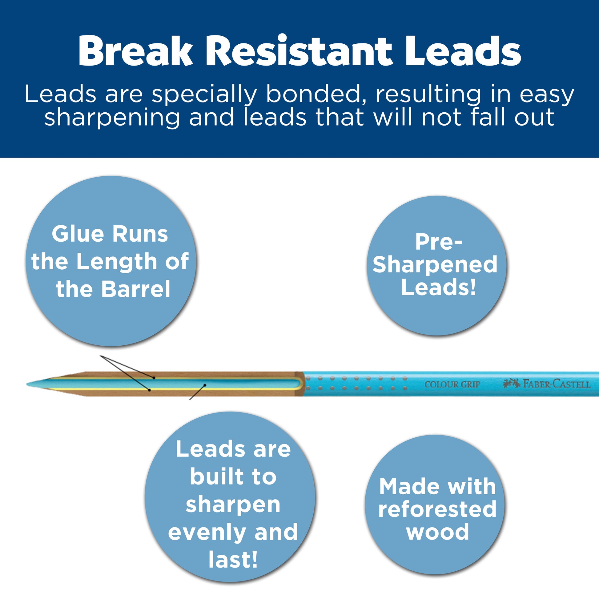 Made from re-forested wood, the easy-to-hold triangular-shaped pencil contains a soft-grip zone for a secure hold. Break-resistant leads are easy to sharpen.