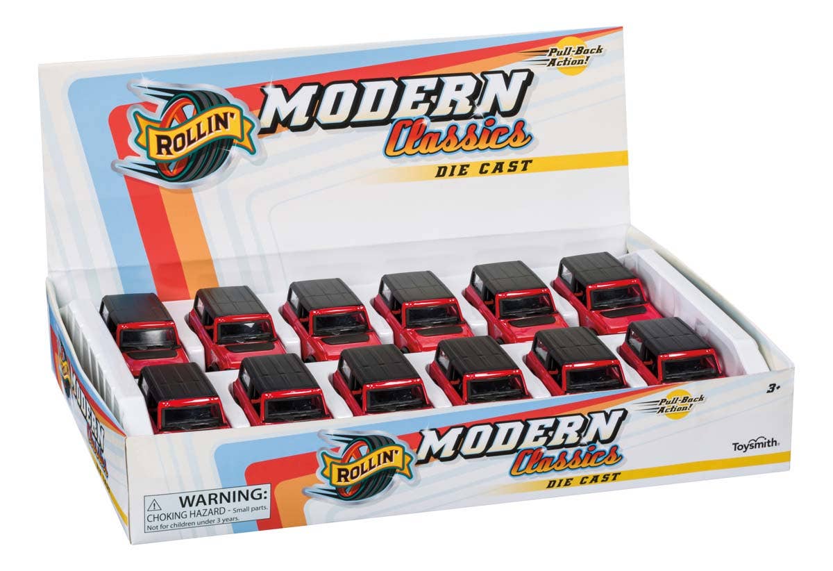 Modeled off the new 2021 Ford Bronco, this realistically detailed 4.5-inch die cast toy car comes in bright cherry red with a black top, open side windows and black side-runners. Designed to come out of the display box on the shelf and into a kid’s imaginary world of off-roading through the mountains, each car leverages a pull-back mechanism or instant pull-and-go play. Available in sets of 12 with branded display case for quick selling.