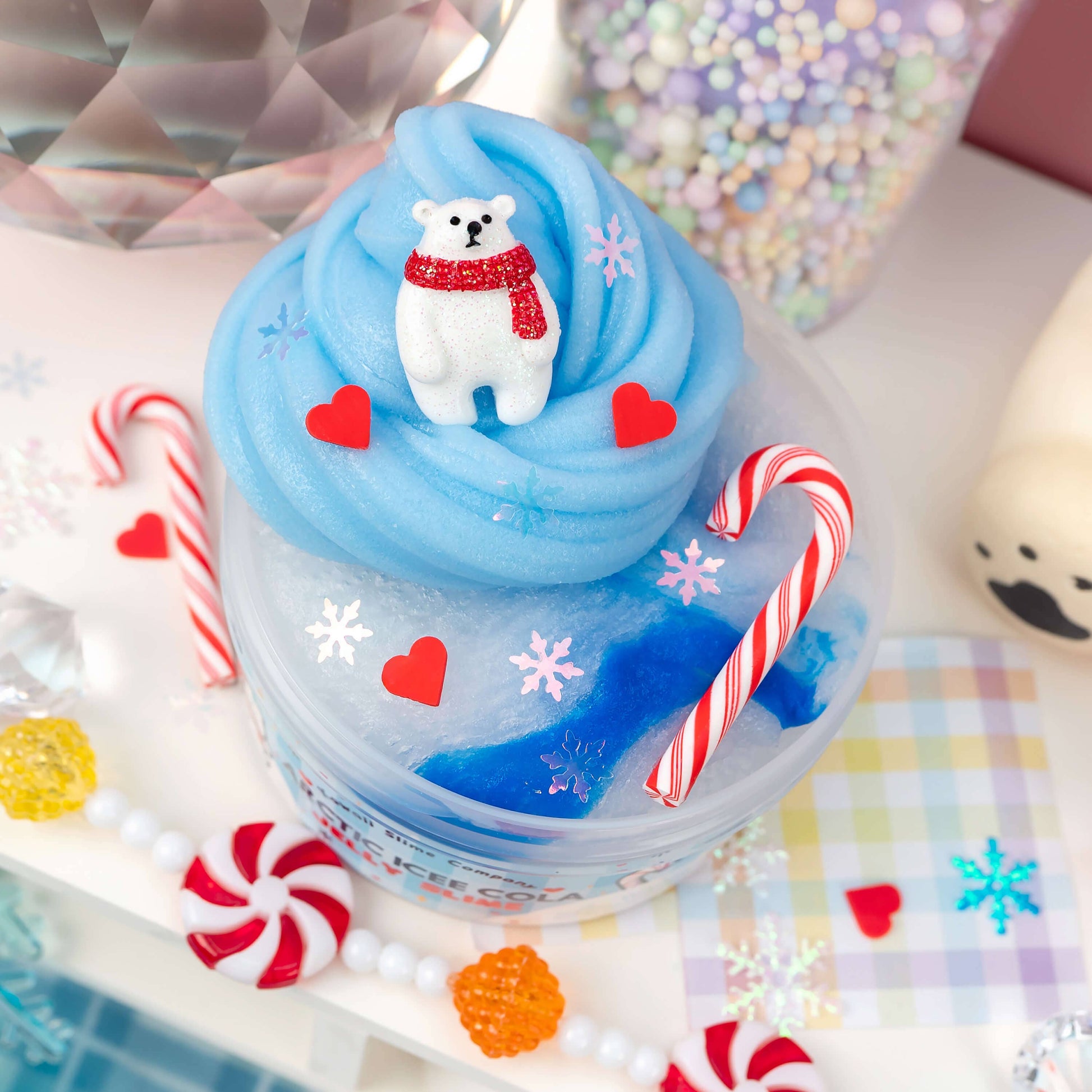 Brrrr! This icy blue and white Slime was inspired by the Coca-Cola polar bears that come every year during the holidays. We scented this just like a fizzy cola soda and include the most adorable charms. Our Jelly Slime has a unique icy feeling texture, perfect for poking, inflating or bubble pops!