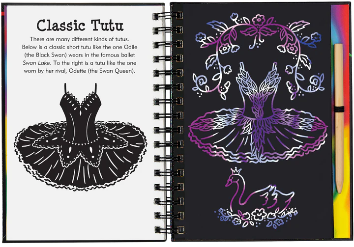 This is a Trace-Along Scratch and Sketch! White outlines on black scratch-off pages enable young children (5 and up) to trace favorite ballet illustrations, revealing patterns, swirls, and holographic colors beneath.