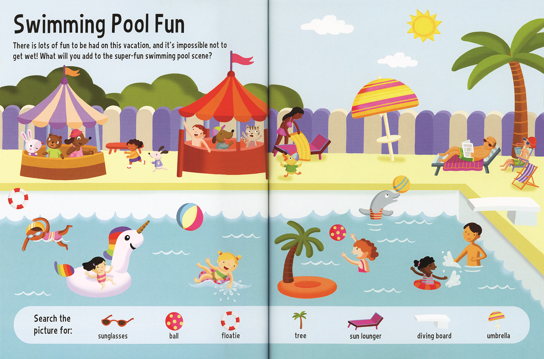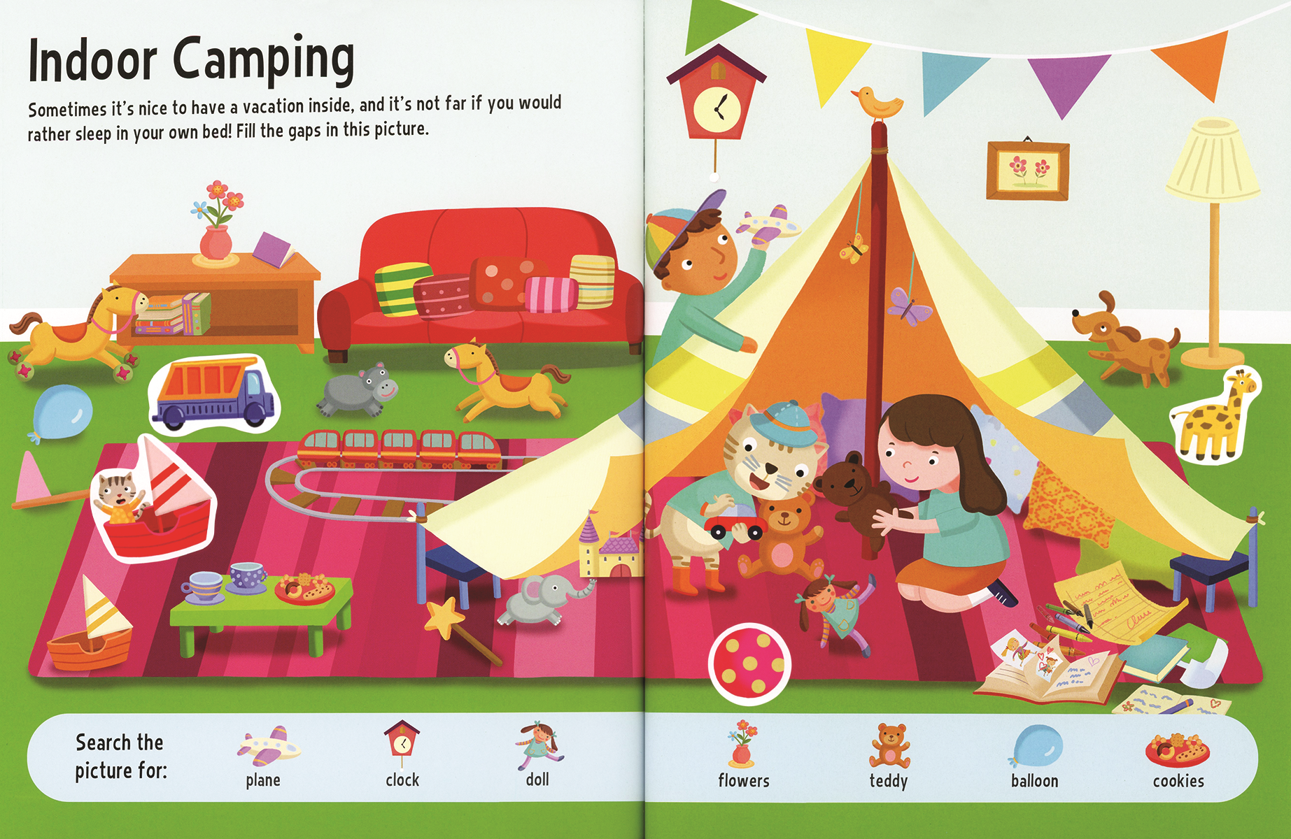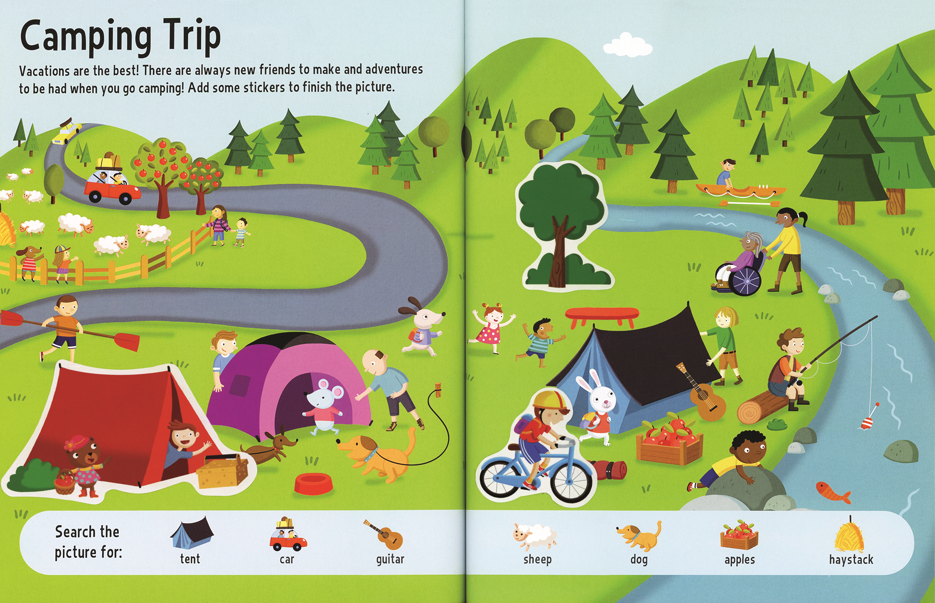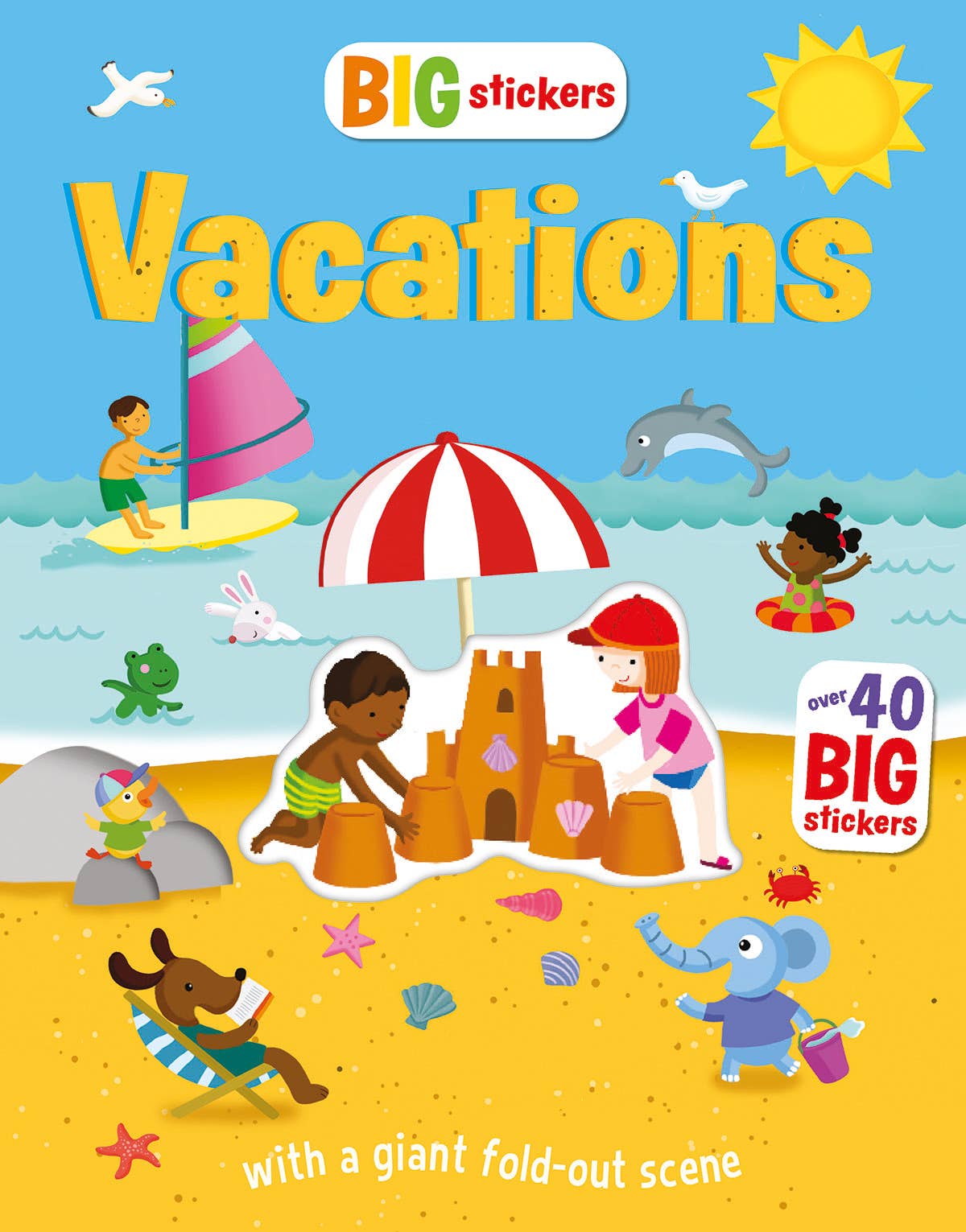 Let's go camping! Or maybe to the beach! It's vacation time! Designed for little hands, these big sticker books offer activities, lots of items to spot, and a huge fold-out scene. Great for improving fine motor skills and dexterity, building vocabulary, and creative play!