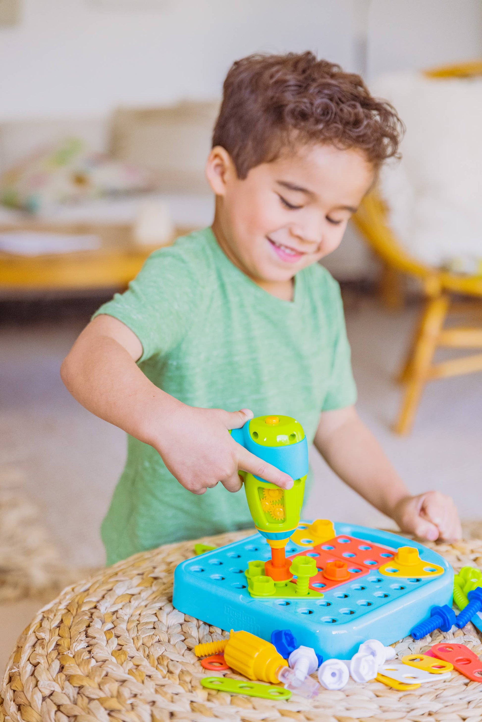 Construction meets creativity with this STEM learning set! Preschoolers use a kid friendly power drill, decorative design plates, and matching bolts to create colorful works of art. Includes activity board with handle, drill, screwdriver, Philips bit, socket bit, 24 design plates, 44 bolts, and guide with patterns to copy.