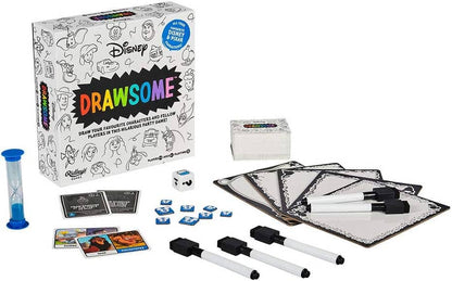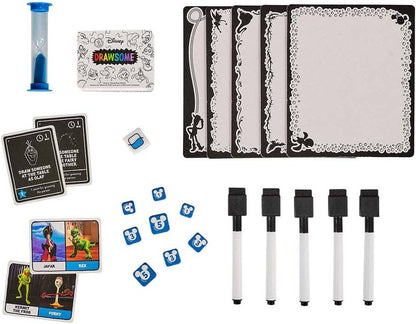 Ever wondered what Buzz Lightyear and Nemo would look like drawn mashed together as one character, or what you'd look like as a Disney Princess? Find out in Disney Drawsome from Ridley's Games! Draw ing Game featuring cards with challenges to draw Disney and Pixar characters and fellow players. Contains x95 cards, x70 tokens, x5 drawing boards, x5 pens, sand timer, game dice and instructions. 3 -10 players. Ages 8+. Average 30mins playtime.