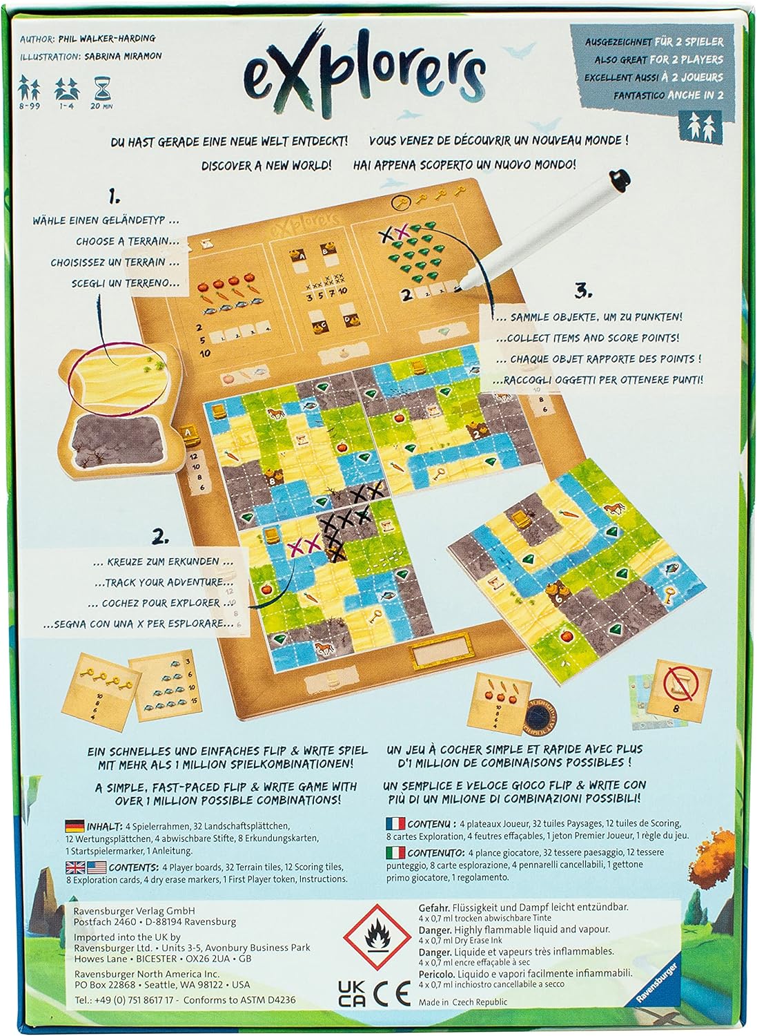 Delve into a new, untouched world. Its terrain, made up of levitating rocks that are constantly shifting, has allowed it to remain hidden for centuries. Now, it’s ready to be explored. Travel through this strange new world in search of gems, keys to hidden temples, animals, and more. Plan your route wisely, using your map to score the most points and become the greatest explorer of all time. Become The Greatest Explorer of All Time In this flip and write game, you’ll travel through a beautiful landscape made up of prairie, water, desert, and mountains. Using the included dry-erase marker, mark your travel with X’s on your map as you go, while coming across different places and objects made up of provisions, precious stones, villages, animals, and even keys that open hidden temples. All help players earn points. Because all players explore the same landscape during the game, it’s your decisions that determine who wins and who loses.