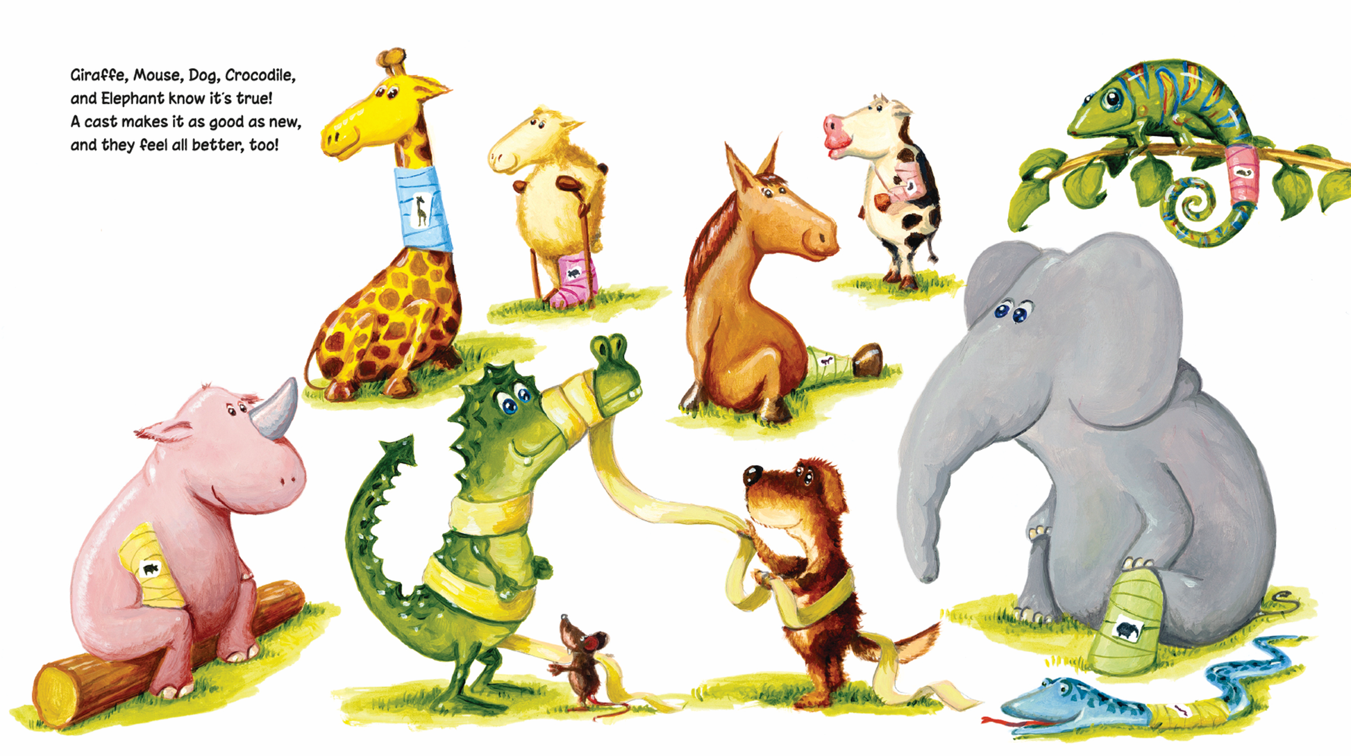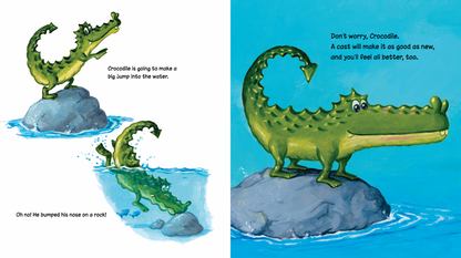 Giraffe hurt his neck and Elephant hit her knee … but a cast makes it better. Young readers will eagerly use the reusable stickers to help make the animal friends “feel better too.”