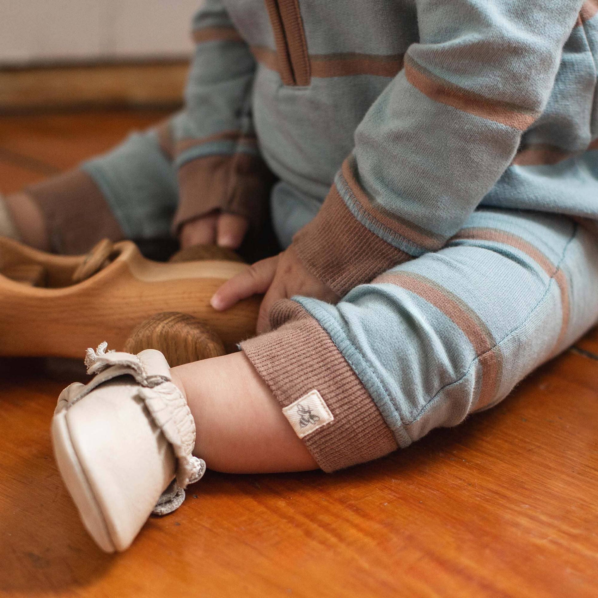 * Snaps at diaper line for easy changes and zipper guard at neck