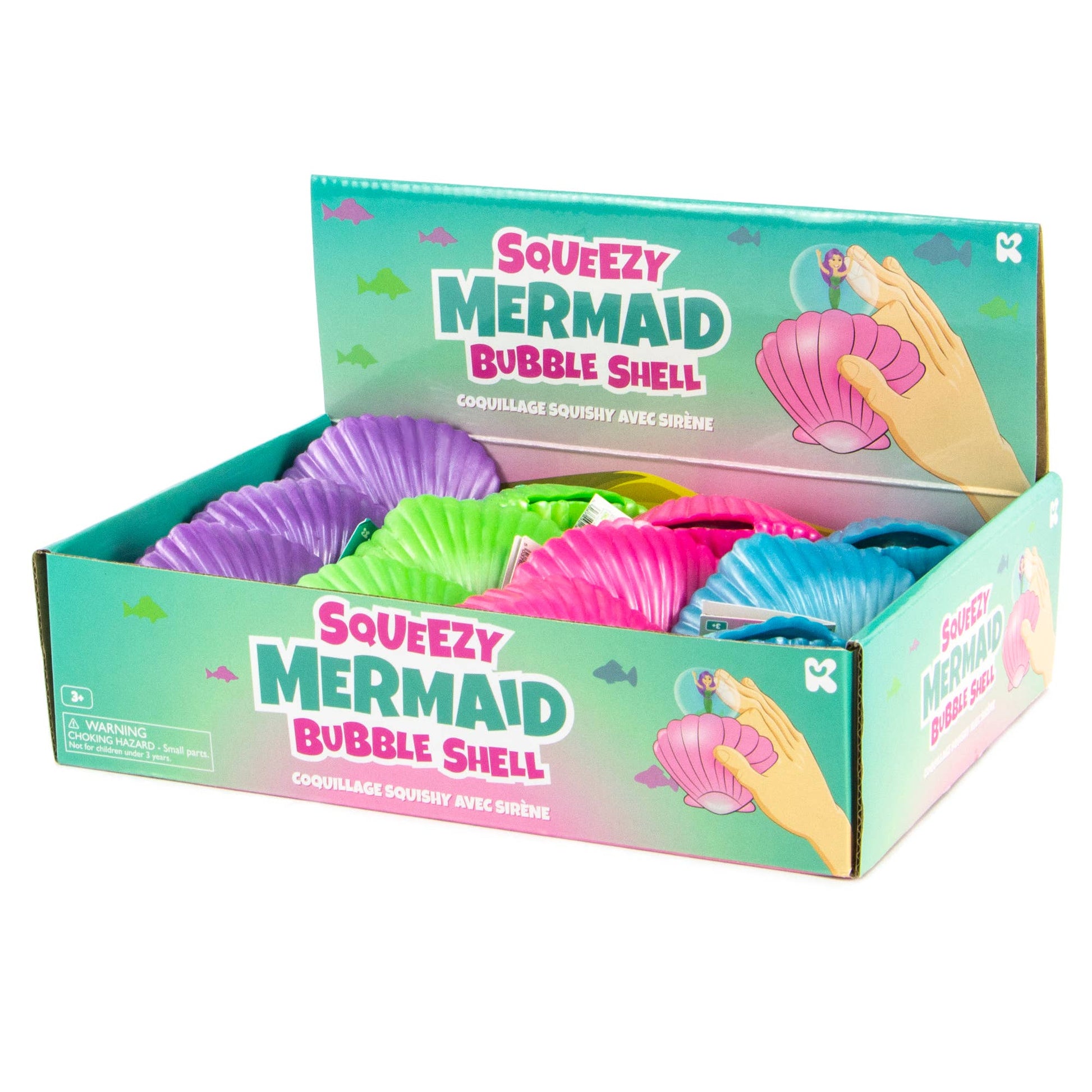 Clamshell with a squishy center! Squeeze the shells to make a bubble pop out and watch as a little mermaid figurine appears. Addictively squishy!