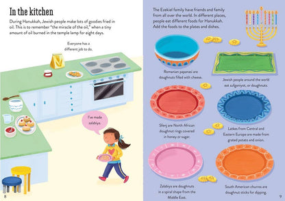 Gather round the table to light the menorah, it's time to celebrate the eight days of Hanukkah. Discover the food, songs, games, and more for the Jewish festival of lights - not to mention all the presents and Hanukkah gelt. Learn all about the ancient story of Hanukkah, too, with stickers.