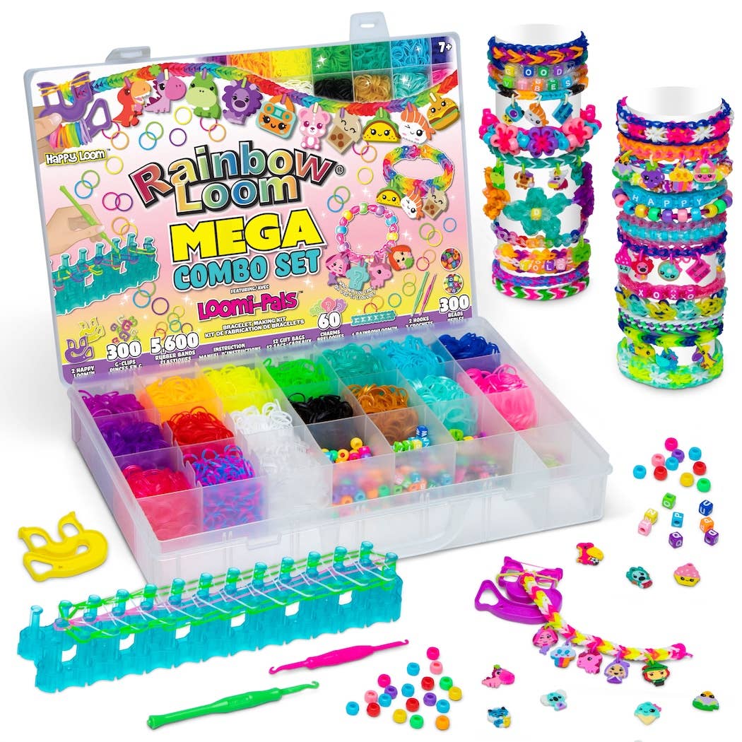 1 Rainbow Loom 2.0, 2 Happy Loom™, 60 Loomi-Pals® charms, 5,600 rubber bands(17 colors), 300 G-clips, 300 assorted beads, 2 hooks, 12 gift bags, 2 easy-to-follow instruction sheets, organizer case