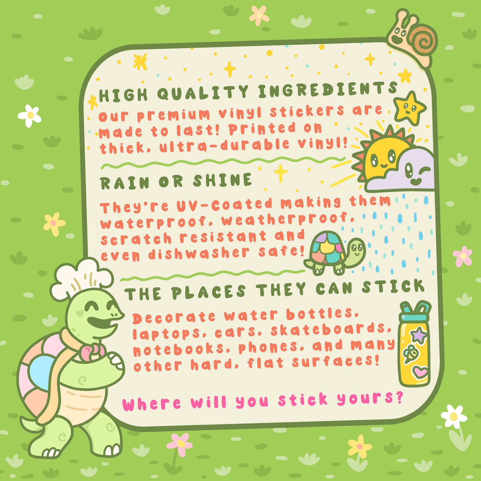 š¢ Our Turtley Awesome vinyl stickers are made from the highest quality ingredients on the market! Printed on thick, ultra-durable vinyl, these stickers are made to last. They're UV-coated making them waterproof, weatherproof, and dishwasher safe!