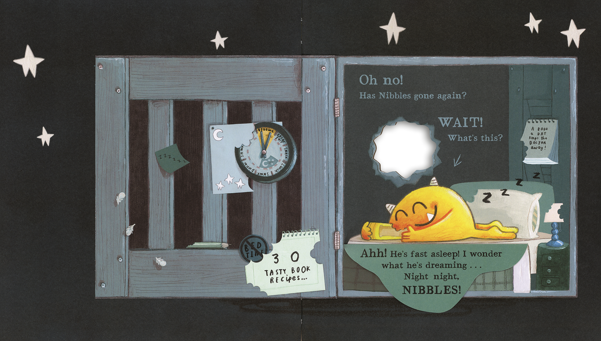 It's bedtime and time for all little monsters to be tucked up into bed... but wait! Oh no, Nibbles! You're supposed to read bedtime stories, not eat them!