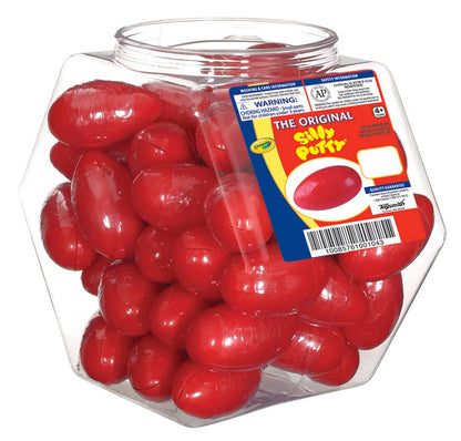 The popular classic standard toy of putty fun since 1950, Silly Putty is a unique substance that stretches without breaking and bounces high like a ball. A fun fidget toy, each pink-colored Silly Putty comes contained within a classic red plastic eggshell case. Available in a set of 48 with clear plastic display holder. Based on a silicone polymer and contains a viscoelastic liquid silicone, a type of non-Newtonian fluid, that allows this putty to act like a viscous liquid over a long time period but like an elastic solid for a short time period. Silly Putty bounces, stretches, floats, molds into shapes, picks up pencil marks, resists some pressures and flattens with others, and yet somehow always provides a soft, malleable feel.