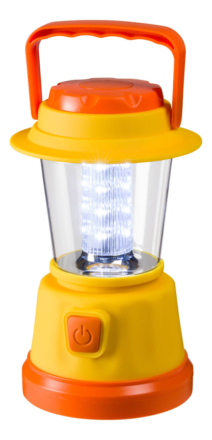 The Outdoor Discovery LED Lantern from Outdoor Discovery. The lantern stands 7 inches tall and comes in an assortment of bright colors. Lanterns are two-toned in color combination of light green, dark green, and yellow, orange Features steady and flashing light modes and a push-button on the front to power the lantern ON and OFF. A finger-imprinted carrying handle makes it comfy and easy for little hands to carry and hold. Requires 4 AA batteries. Batteries are not included.
