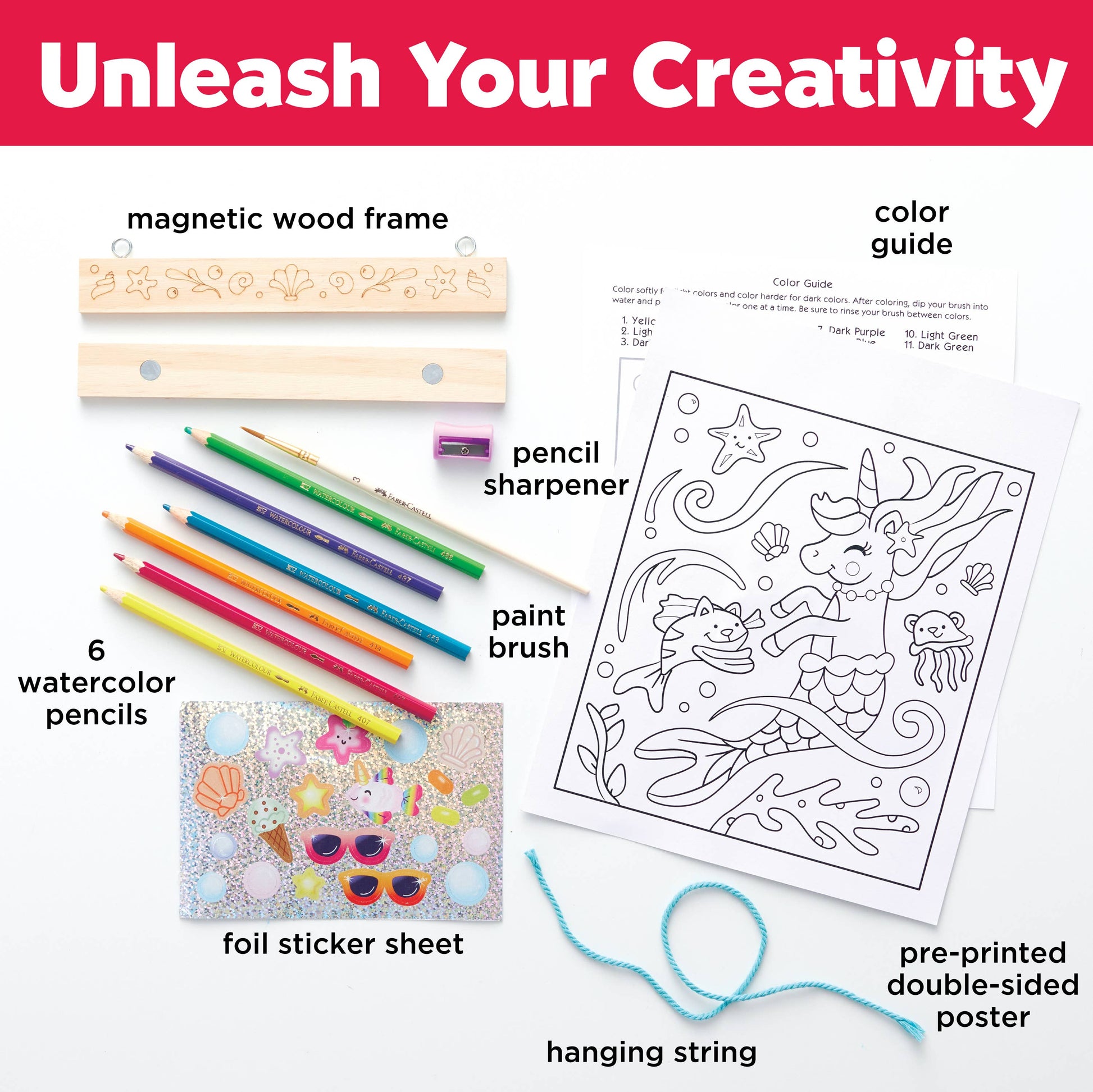 Use the watercolor pencils to color the adorable kitty, puppy, and unicorn dressed up like mermaids on the double-sided illustrated poster.