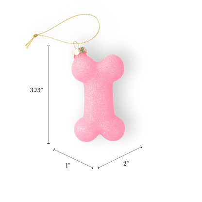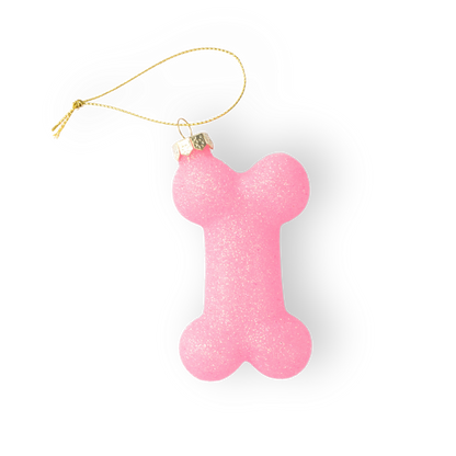 A charming pink glass bone ornament decorated with glitter. Perfect for dog lovers and pet owners.