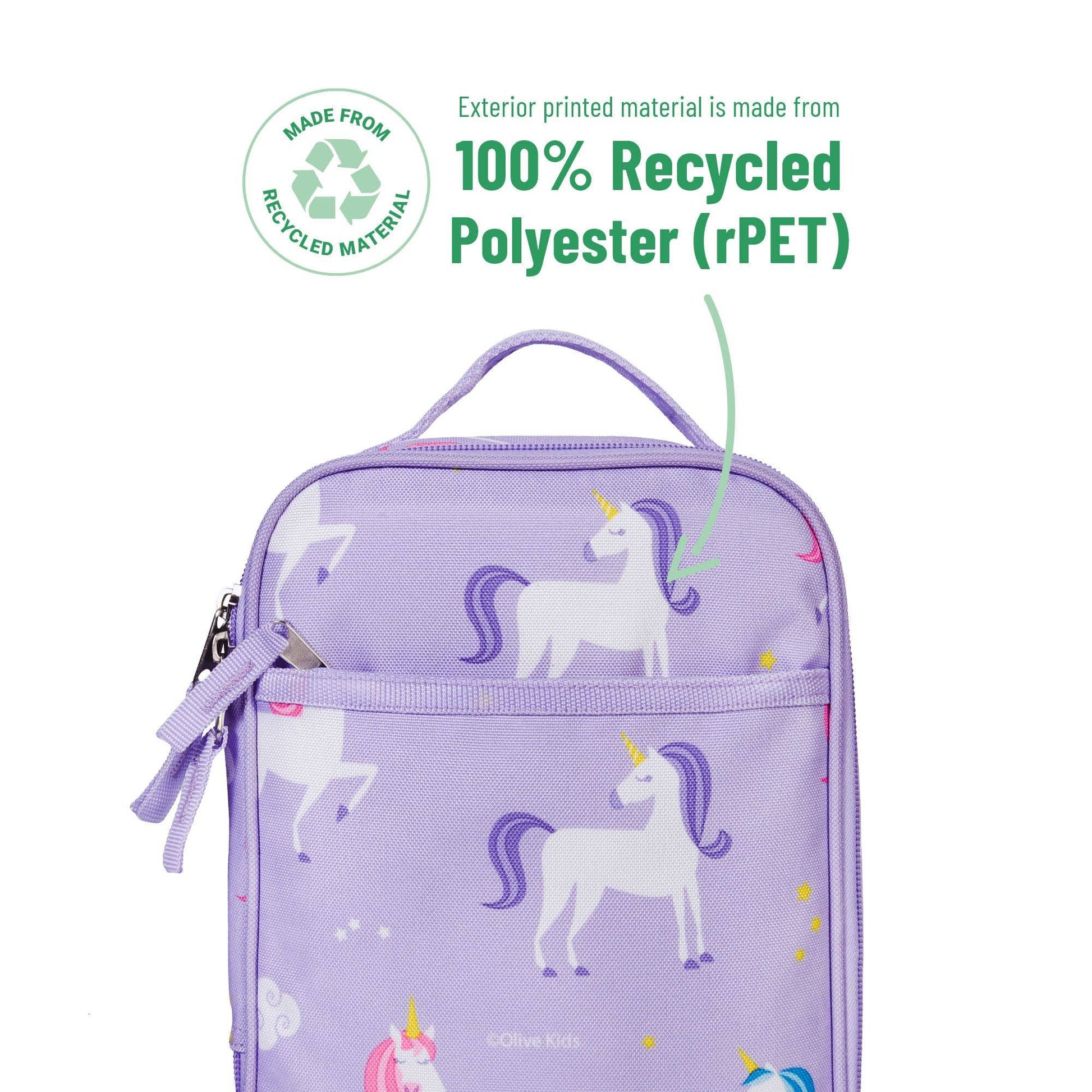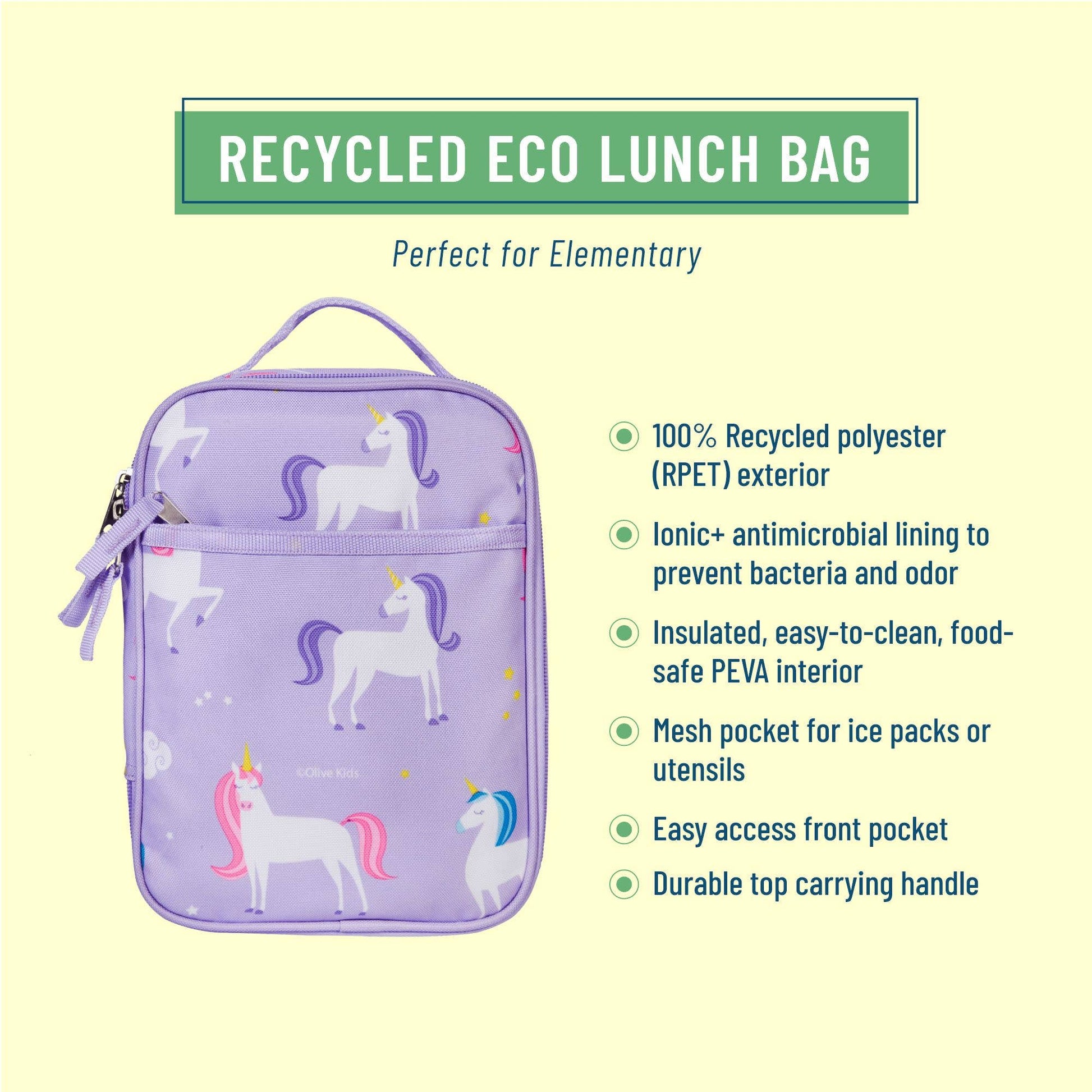 At Wildkin, we know that details matter to you and your child, and we made sure that our Wildkin Kids Eco Lunch Bag for Boys and Girls was designed with that in mind. The double-zipper closure provides little hands with easy access to their favorite items, while the durable top handle is perfect for hanging in a cubby before and after lunch. A recycled polyester exterior is a sustainable and durable choice, and an antimicrobial Ionic+ lining ensures odor free use. The insulated lunch box will help keep lunch fresh, and the food-safe PEVA interior is easy to clean. Features vibrant and playful designs that coordinate with other items in the Eco Collection.