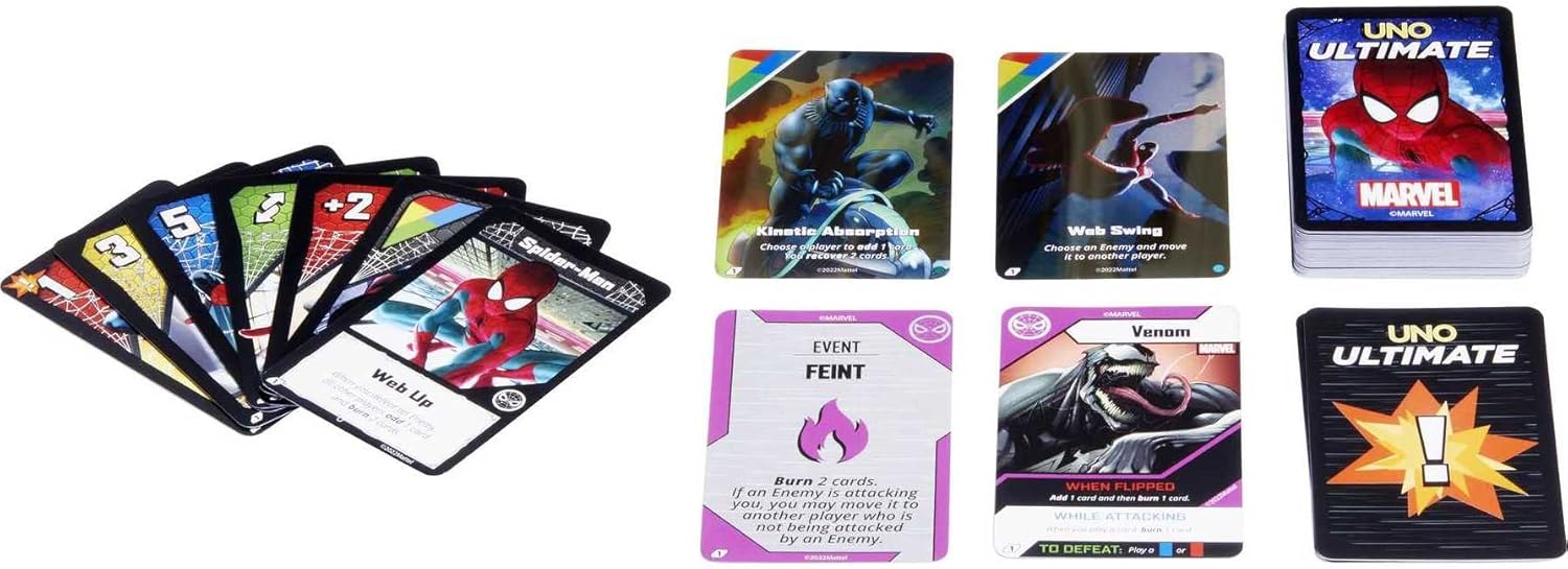 With UNO Ultimate Marvel Add-On Spider-Man Pack, players can swap a new character into the core UNO Ultimate Card Game (sold separately, subject to availability). The Spider-Man Pack has an entire deck of UNO Ultimate cards, with graphics and special rules, designed specifically for this Super Hero to play as Spider-Man! This Pack also includes two collectible Foil Cards that players can collect or use in the game. Makes a great gift for card game lovers and Marvel fans ages 7 years and older. UNO Ultimate Core Card Game is required -the instructions for how to play UNO Ultimate can be found only in the core version of the game. UNO Ultimate is best played with up to 4 players. Colors and decorations may vary.